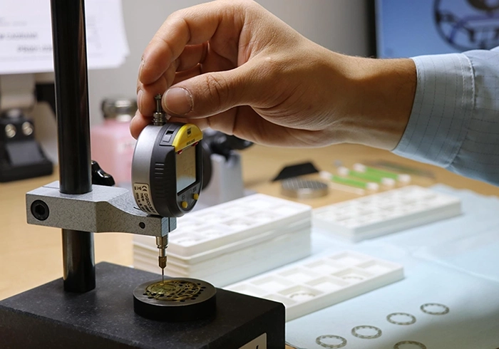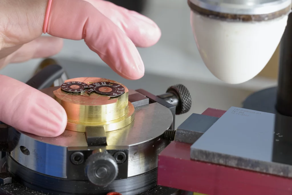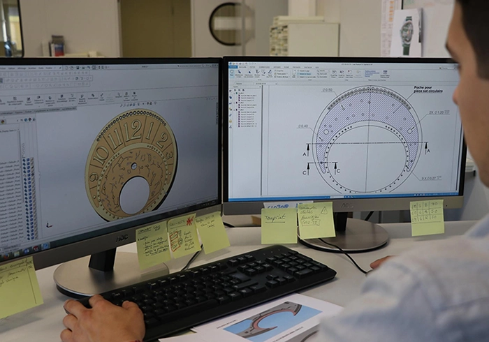 Au sein du bureau technique de LM Cadrans, chefs de projet et concepteurs travaillent ensemble pour transformer les idées en réalité. À l’aide de logiciels de modélisation 3D, chaque détail des cadrans est soigneusement élaboré, jusqu’à la phase de prototypage. La recherche de matériaux innovants et l’application de techniques de fabrication avancées sont au cœur de leurs efforts. En alliant innovation et traditions artisanales, les concepteurs créent chaque courbe pour mettre en valeur l’unicité de chaque cadran, faisant du bureau technique un lieu où chaque pièce reflète l’esprit de vos montres.