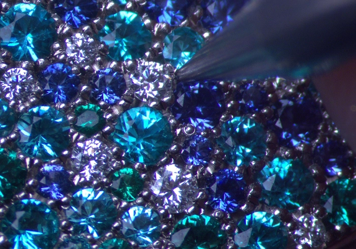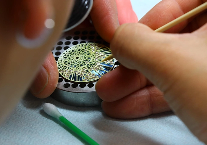 Le décalque est un processus de transfert essentiel qui permet d’appliquer divers motifs et décorations sur des supports tels que les cadrans, les rehauts et les saphirs. Dans notre atelier, nous utilisons des machines manuelles et semi-automatiques pour assurer une qualité constante à chaque étape. La précision est essentielle : chaque détail doit être maîtrisé, car même la plus petite particule de poussière peut affecter le résultat. Grâce à un savoir-faire minutieux et une grande attention aux détails, nous veillons à ce que chaque décalque soit appliqué avec soin, transformant chaque élément en une pièce unique qui répond aux attentes de notre clientèle.